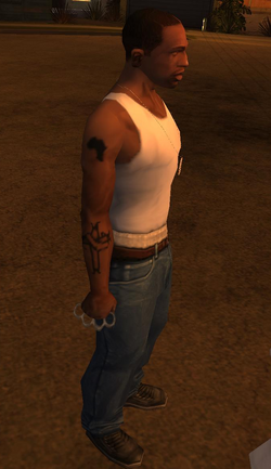 Carl johnson runs a gang named grove street his mother was shot by the ballas another african american street gang that are rivals with the grove street families.